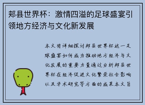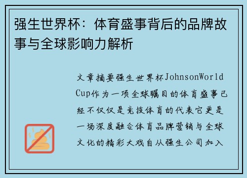 恩平世界杯盛会是近年来备受关注的国际体育盛事,吸引了来自世界各地的顶级运动员和观众。这个盛会不仅展示了各国体育精英的竞技水平,还促进了国际交流与合作,具有重要的全球影响力。本文将从四个方面详细阐述恩平世界杯盛会的精彩纷呈:其一,全球参赛代表的多样性和国际化;其二,赛事组织的高效性和专业性;其三,科学研究与数据分析的助力;其四,赛事对城市文化与经济的深远影响。在探讨这些方面时,我们将通过具体数据分析...